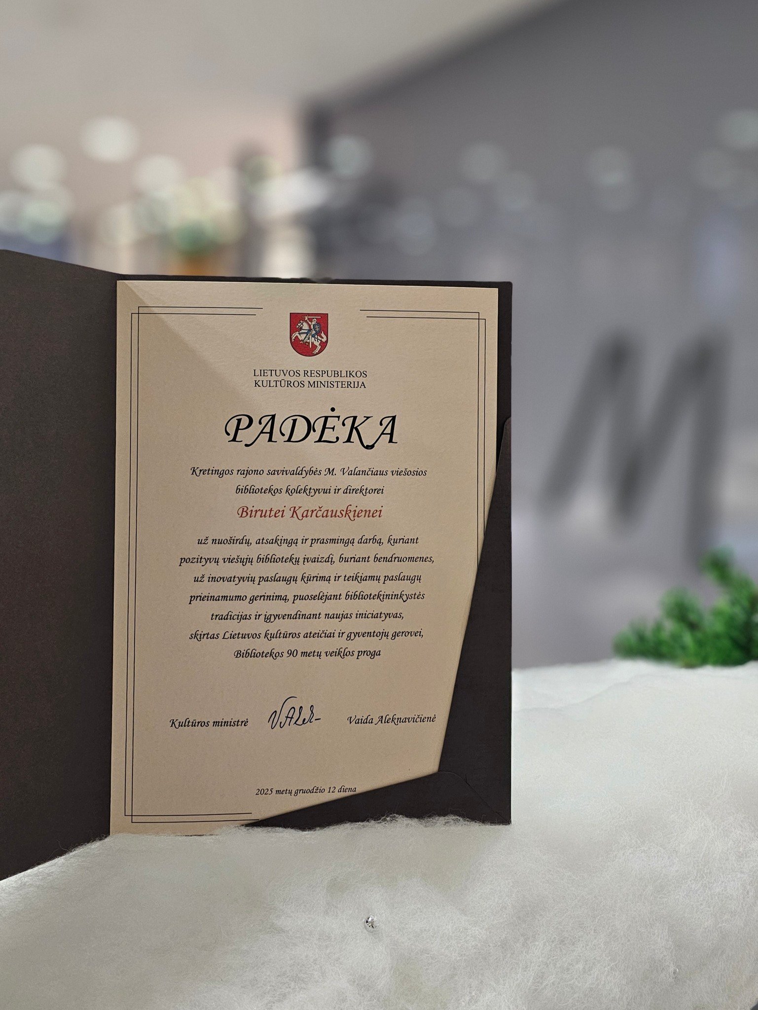 Kristina Kundrotienė kartu perdavė Lietuvos Respublikos kultūros ministerijos sveikinimą bibliotekos 90-mečio proga bei kultūros ministrės Vaidos Aleknavičienės pasirašytą padėką bibliotekos kolektyvui ir direktorei už nuoširdų ir prasmingą darbą stiprinant bibliotekų vaidmenį bendruomenėje, puoselėjant kultūrą ir tradicijas.