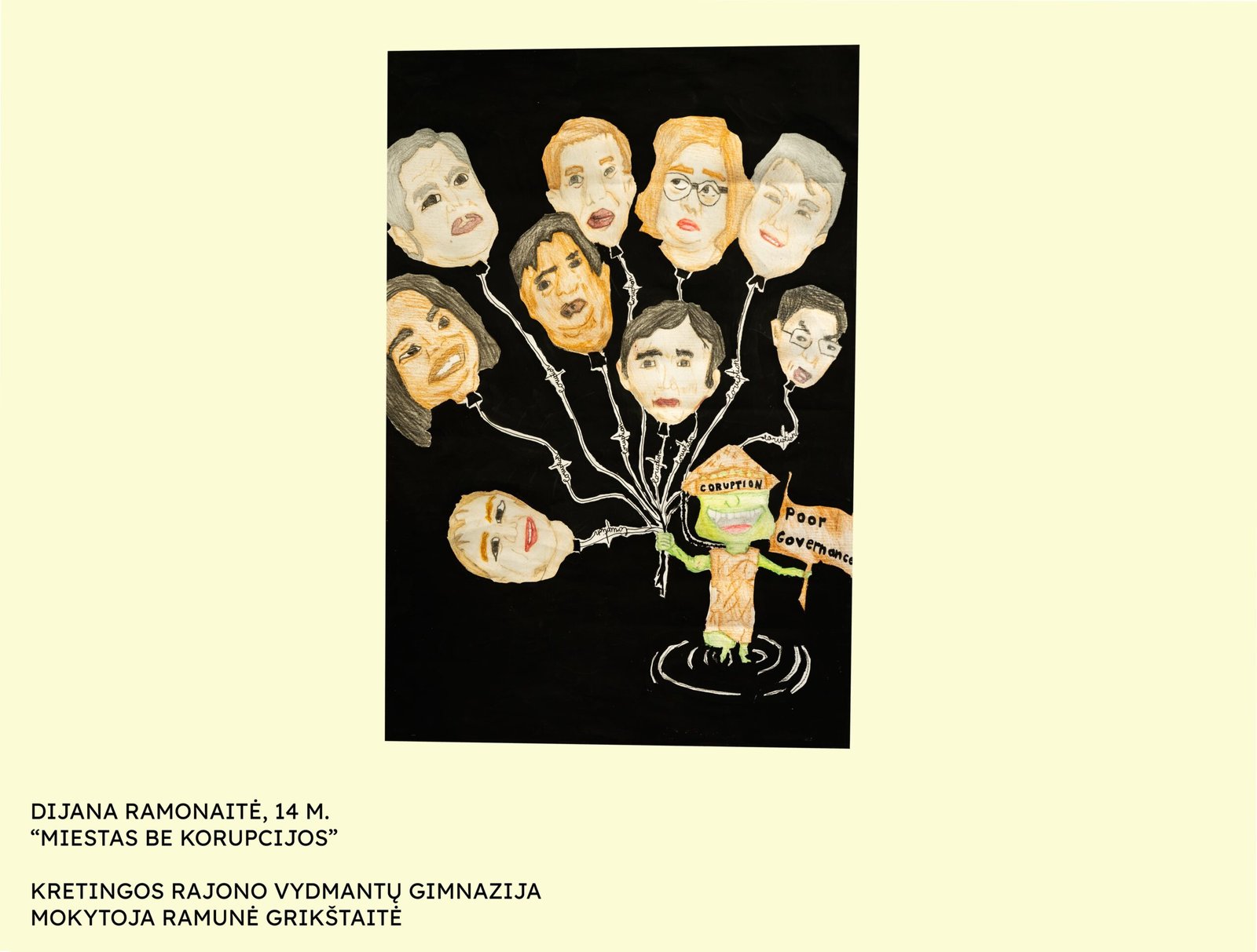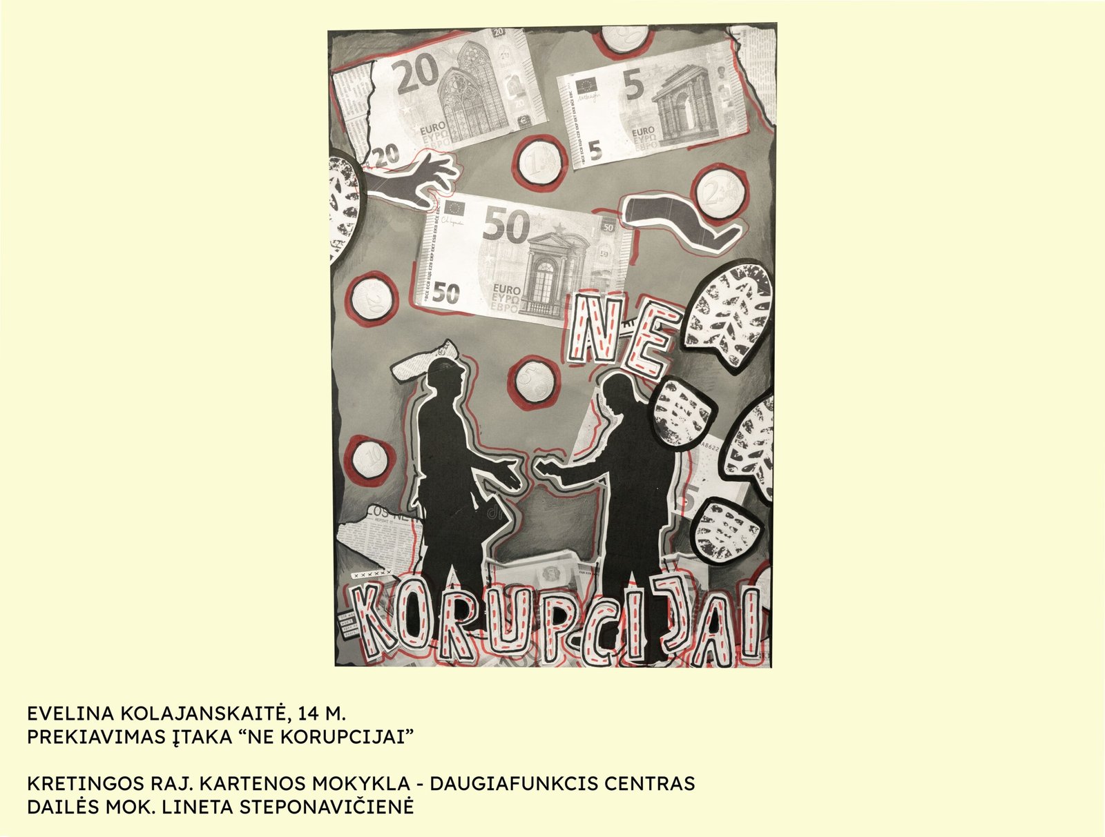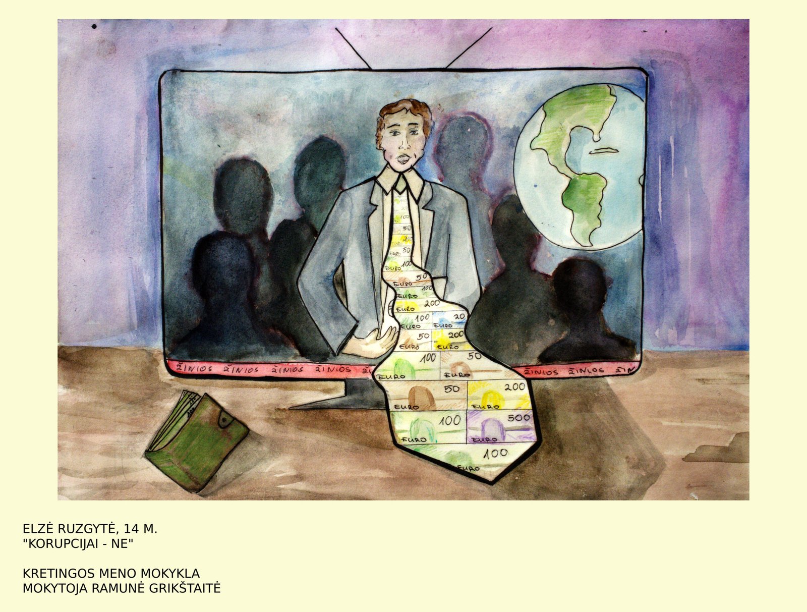 Jau 20 metų, gruodžio 9-ąją, visame pasaulyje minima Tarptautinė antikorupcijos diena. Ji skirta atkreipti dėmesį į korupcijos žalą bei paskatinti užkirsti jai kelią. Šios dienos proga Kretingos rajono savivaldybės administracijos Švietimo skyrius kartu su partnere – Kretingos rajono savivaldybės tarybos Antikorupcijos komisija – kasmet organizuoja kūrybinių darbų konkursą „Mes prieš korupciją“. Šiemet konkursui pateikti 27 kūrybiniai moksleivių darbai iš 10 Kretingos rajono mokyklų, mokinius ruošė 9 mokytojai.