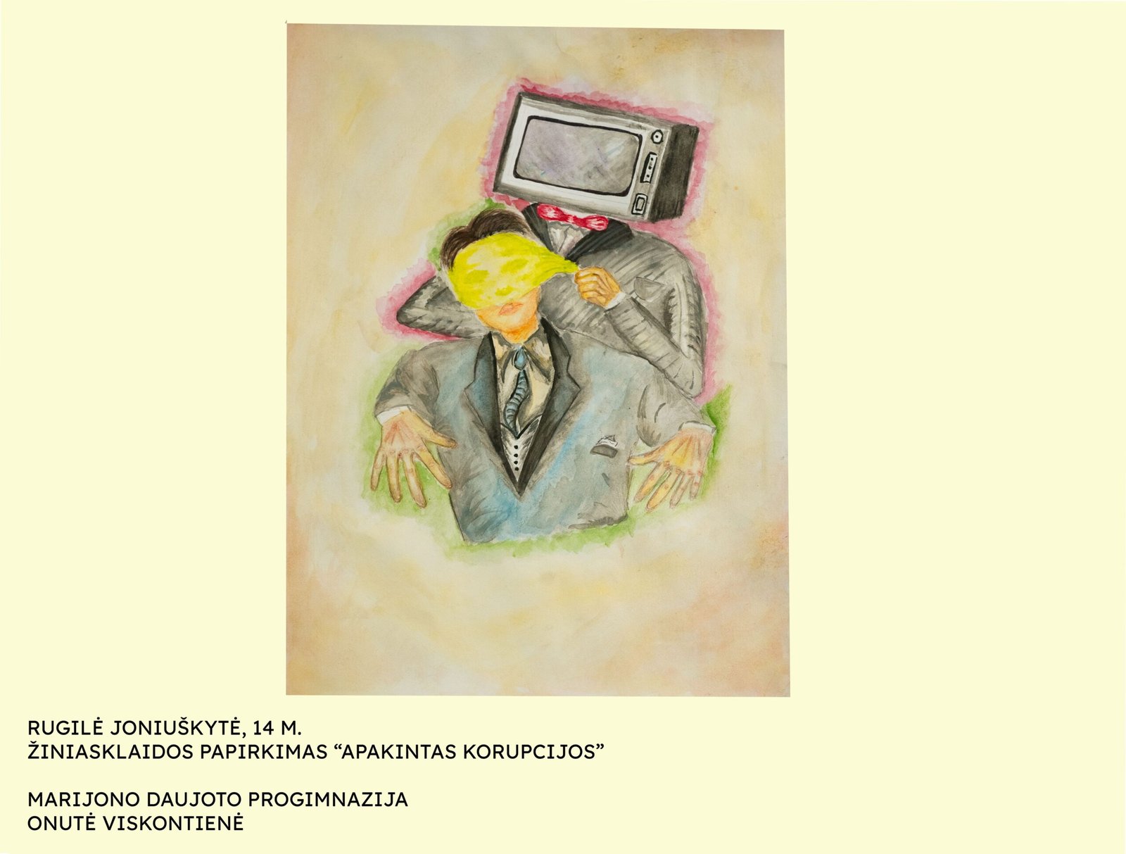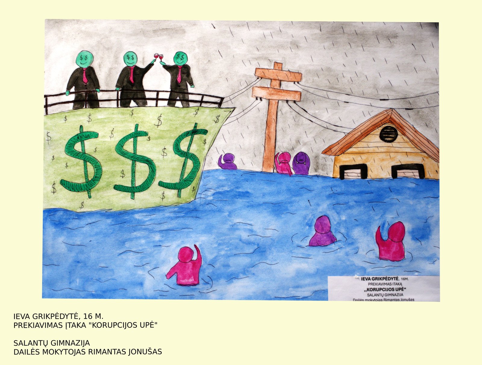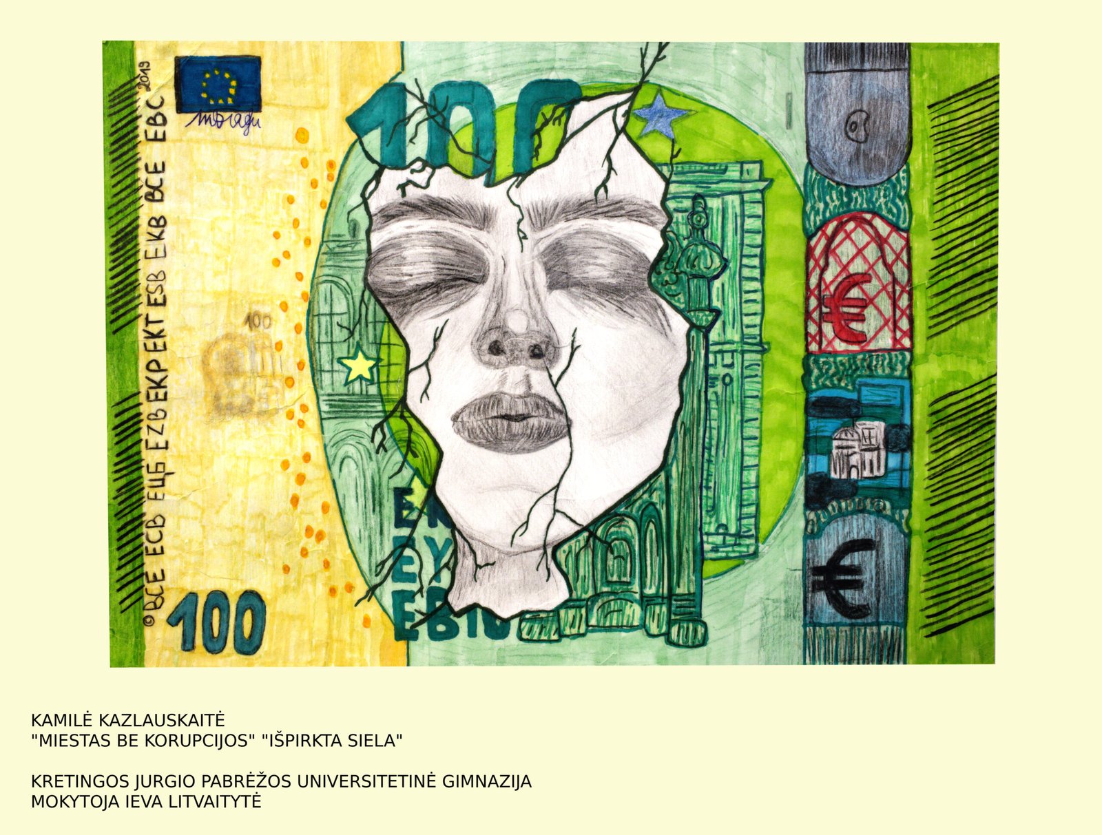 Ievai Grikpėdytei, Kretingos rajono Salantų gimnazijos mokinei, už savitą temos interpretavimą (darbas „Korupcijos upė“; mokytojas Rimantas Jonušas);