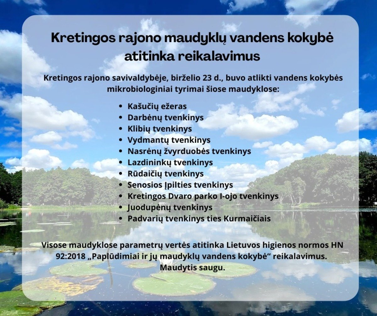Birželio 10 d. atlikti Kretingos rajono maudyklų – Kretingos Dvaro parko I tvenkinio, Juodupėnų tvenkinio, Kašučių ežero, Padvarių tvenkinio ties Kurmaičiais, Darbėnų tvenkinio, Klibių tvenkinio, Vydmantų tvenkinio, Nasrėnų žvyrduobės tvenkinio, Lazdininkų tvenkinio, Rūdaičių tvenkinio, Senosios Įpilties tvenkinio – vandens kokybės mikrobiologiniai tyrimai. Tirtose maudyklose maudytis saugu.