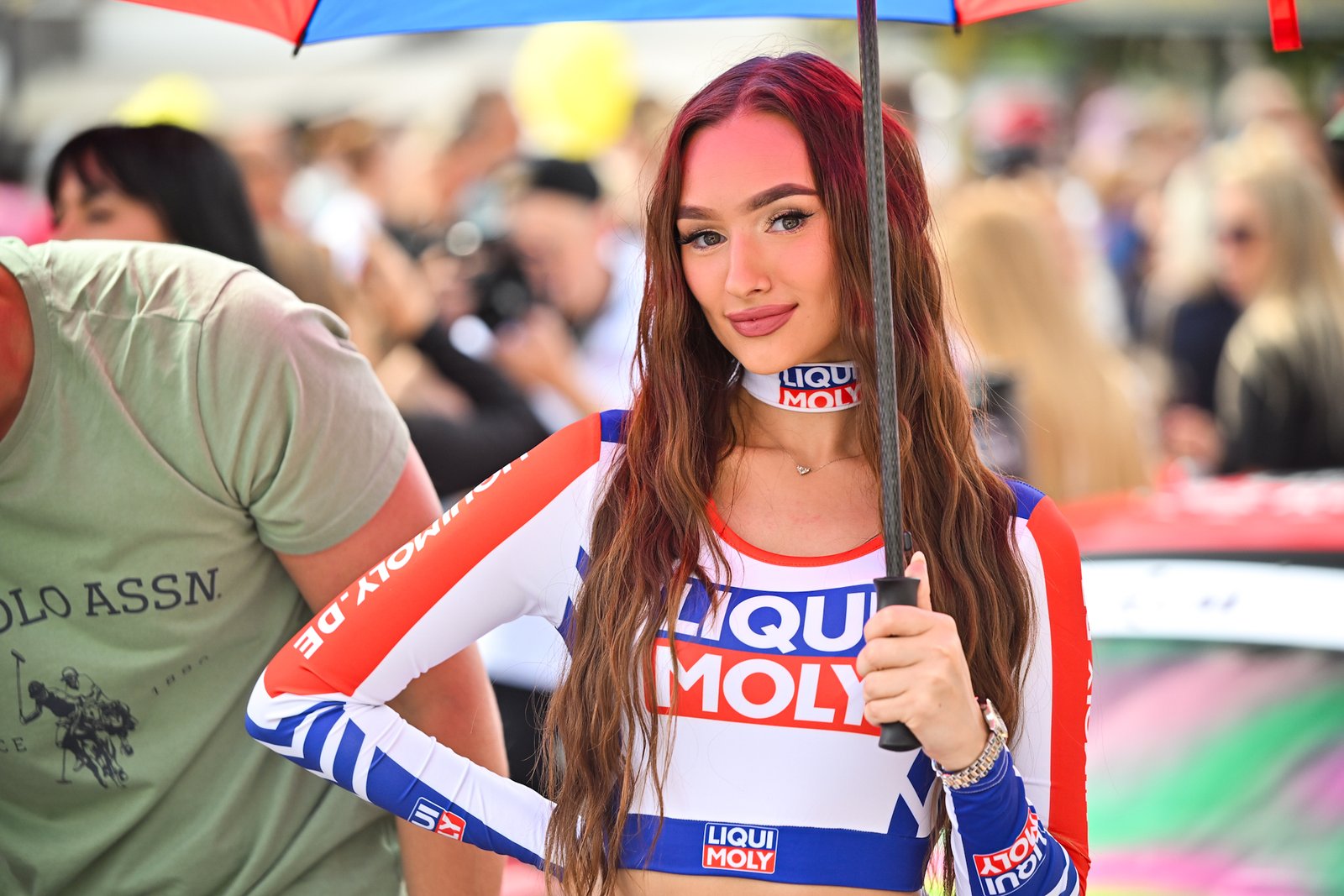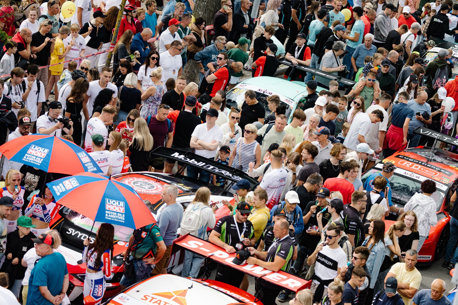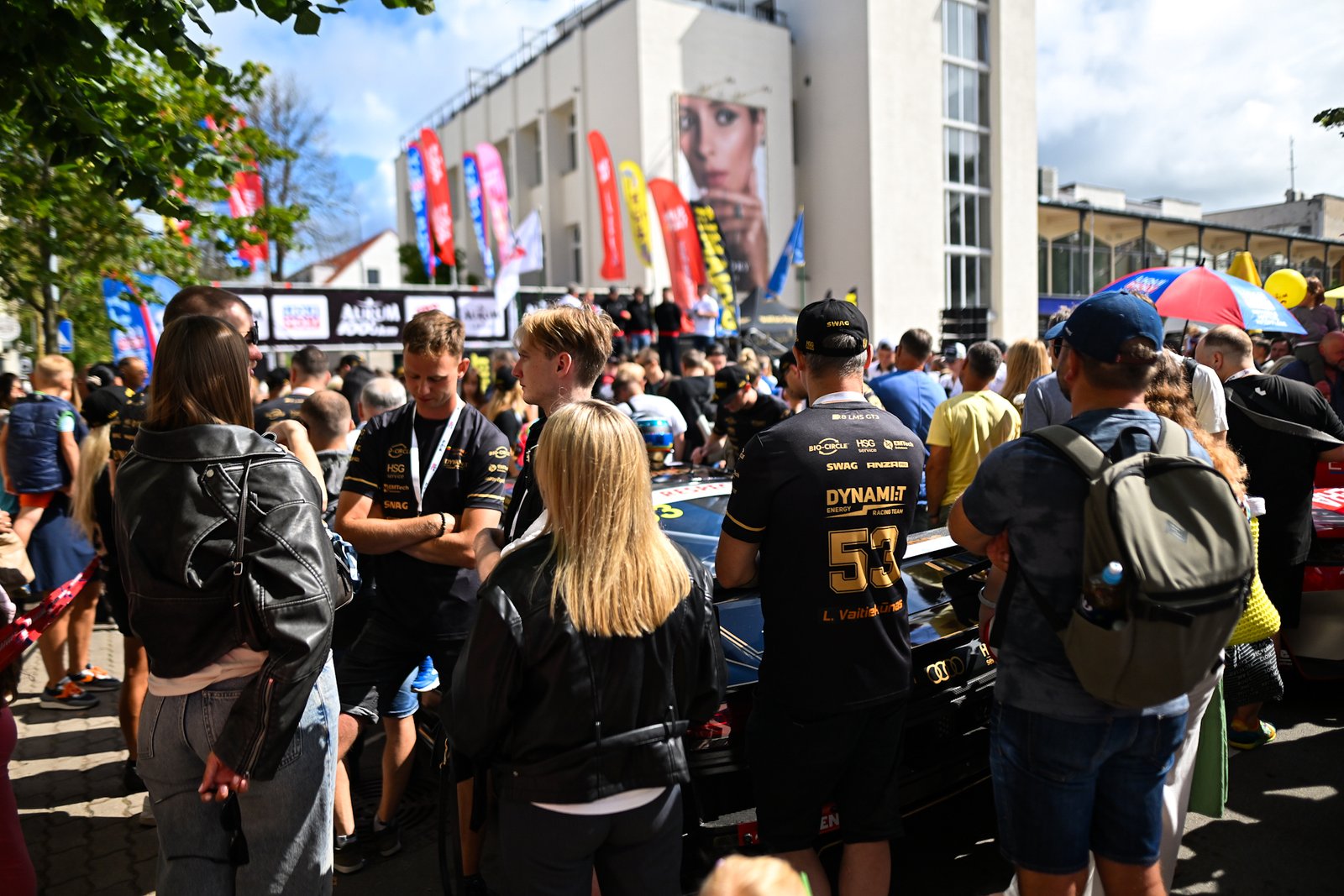 Automobilių sporto gerbėjai tirštai apsupo čia išrikiuotus, spalvingai išdažytus, lenktynėms paruoštus tviskančiu automobilius ir vasariškai nusiteikusias gražuoles, siūlančios atsigaivinti renginio rėmėjų „Aurum“ ar „Dynami:t“ naujausio asortimento produkcija.