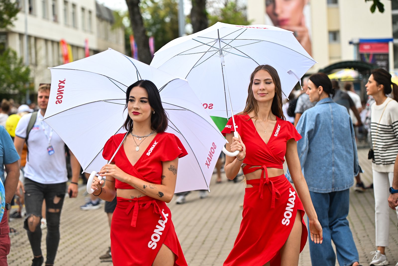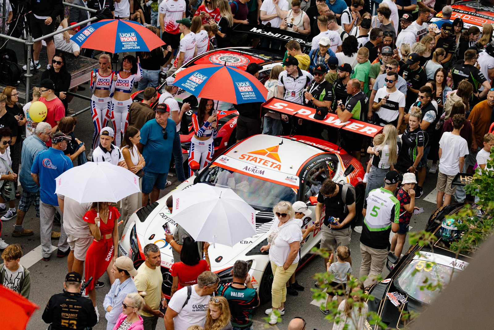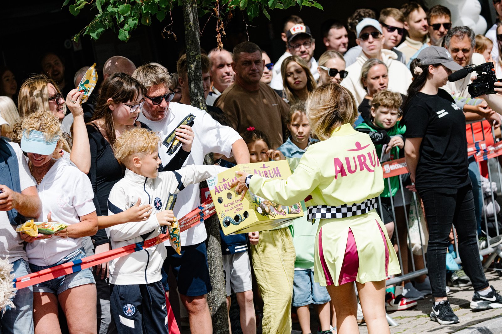Automobilių sporto gerbėjai tirštai apsupo čia išrikiuotus, spalvingai išdažytus, lenktynėms paruoštus tviskančiu automobilius ir vasariškai nusiteikusias gražuoles, siūlančios atsigaivinti renginio rėmėjų „Aurum“ ar „Dynami:t“ naujausio asortimento produkcija.