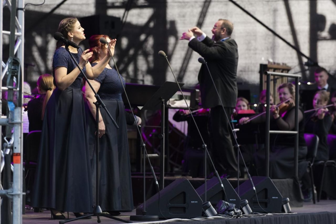 Koncerto programą pratęsė Klaipėdos valstybinio muzikinio teatro mišrus choras, atlikęs lietuvių patriotines dainas ir liaudies dainų išdailas. Skambėjo choro atliekama Atgimimo laikų dvasios persmelkta teatro vyriausiojo chormeisterio ir kompozitoriaus Vladimiro Konstantinovo daina „Tau Tėvynės dangus“, Alio Balbieriaus eilėmis ir Klaipėdos kraštą reprezentuojančios lietuvininkų dainos „Jau aušt aušružė“ išdaila, choro dirigentės ir kompozitorės Danguolės Beinarytės dzūkų liaudies dainos „Dzūkit, dzūkit girnelės“ išdaila. Tūkstantinė elingo publika atsistojusi išklausė lietuvių tautinės muzikos pradininko Stasio Šimkaus (1887–1943) dainos „Lietuviais esame mes gimę“ Jurgio Zauerveino žodžiais.
