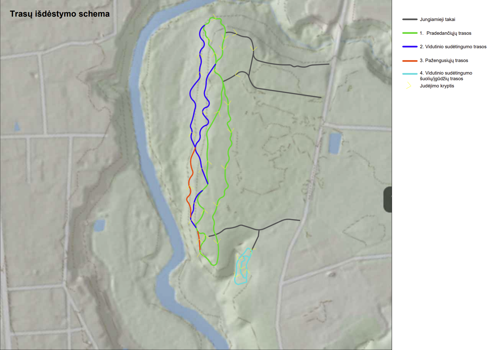 Jungiamieji trasų takai bus apie 1,5 m pločio ir 600 m ilgio. Jie bus įrengti nuo Mėguvos gatvės pradžios iki trasų pradžios. Parke numatytos ir trys poilsio vietos.
