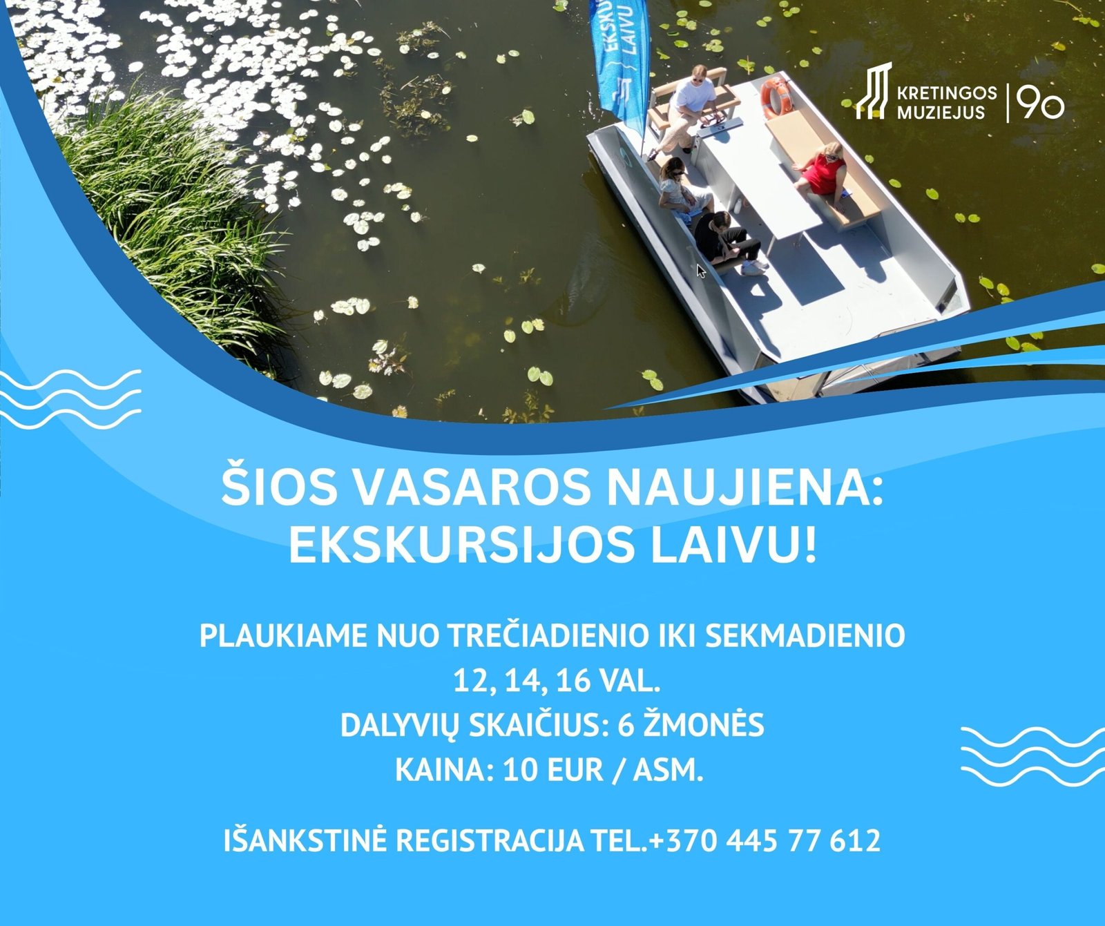 Kretingos muziejaus ir miesto svečiai kviečiami išbandyti šią naujovę trečiadieniais–sekmadieniais 12, 14 ir 16 val. Iš Kretingos muziejaus slėnio turistus plukdysiantis katamaranas leisis upe iki Vandens malūno užtvankos ir čia apsisukęs grįš atgal. Vienu metu laivu galės plaukti iki 6 ekskursijų ant vandens dalyvių. Jie praplauks maždaug 3,6 km distanciją.