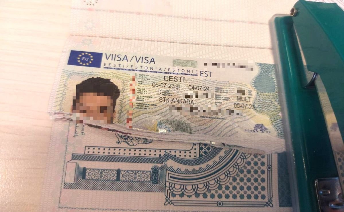 Tarp suplėšytų lapų buvo įklijuota estiška viza, išduota 2023 m. liepos 6 d. ir galiojusi iki 2024 liepos 4 d.
