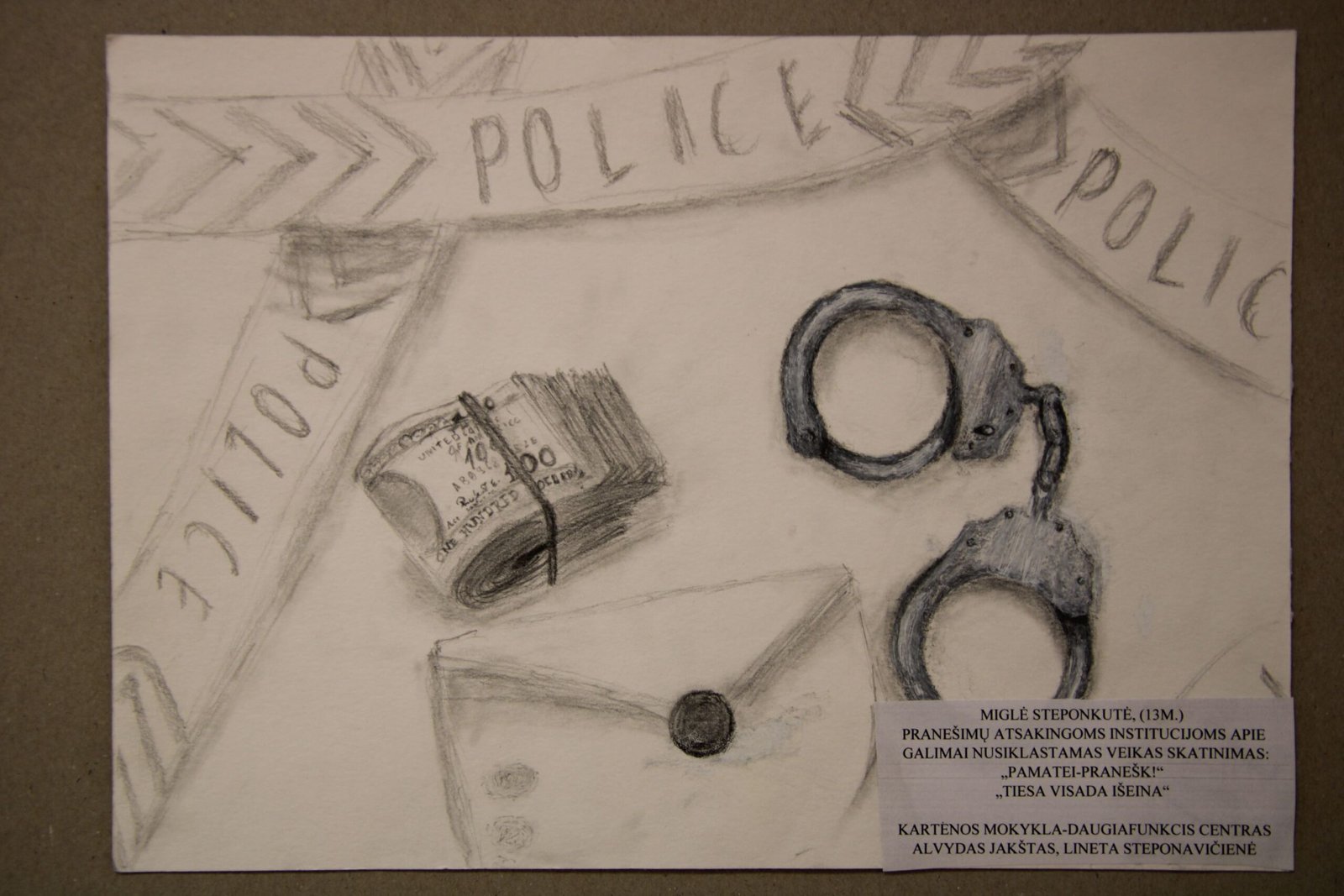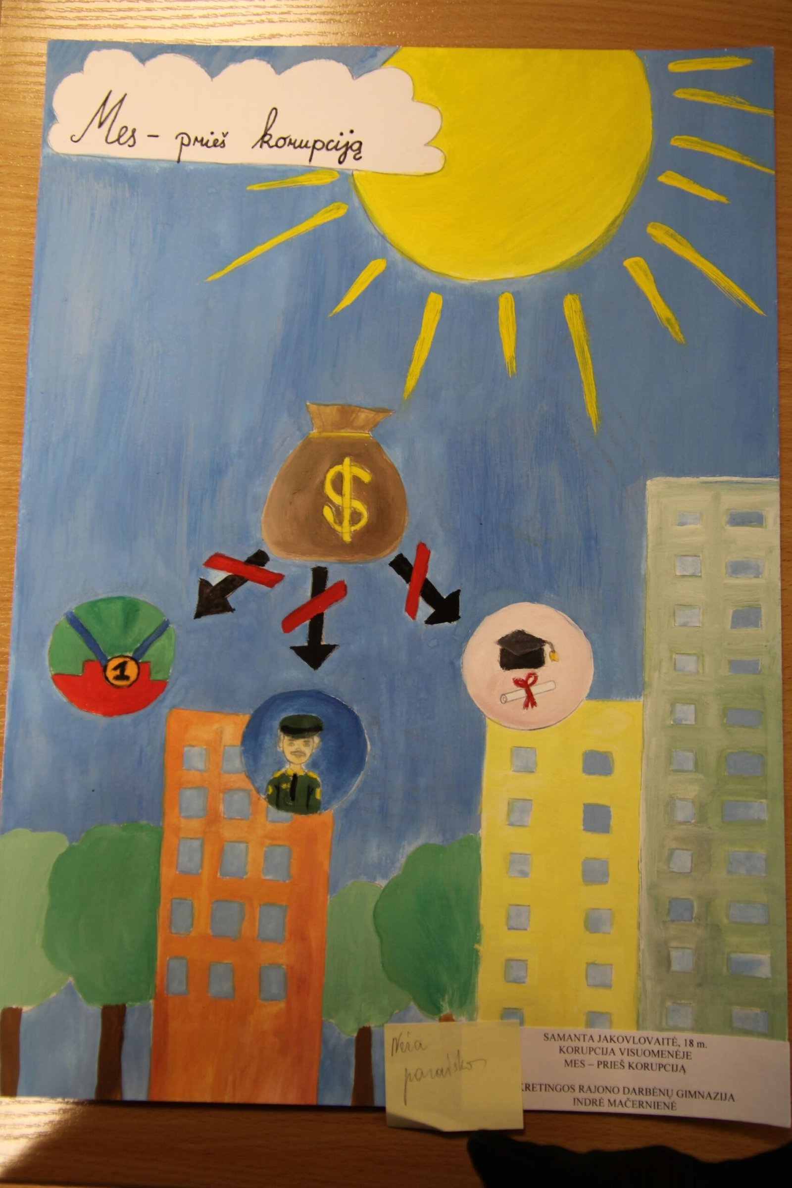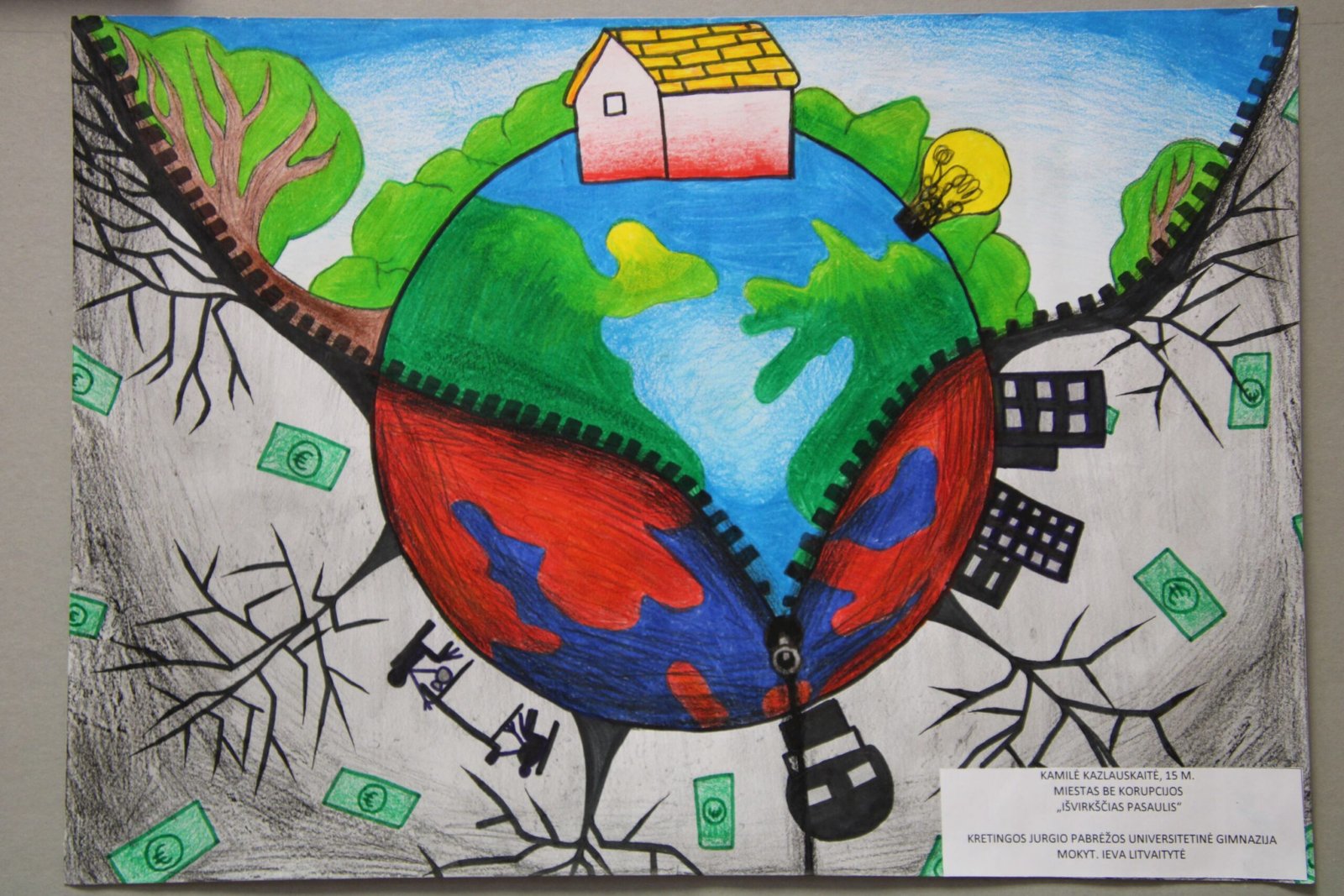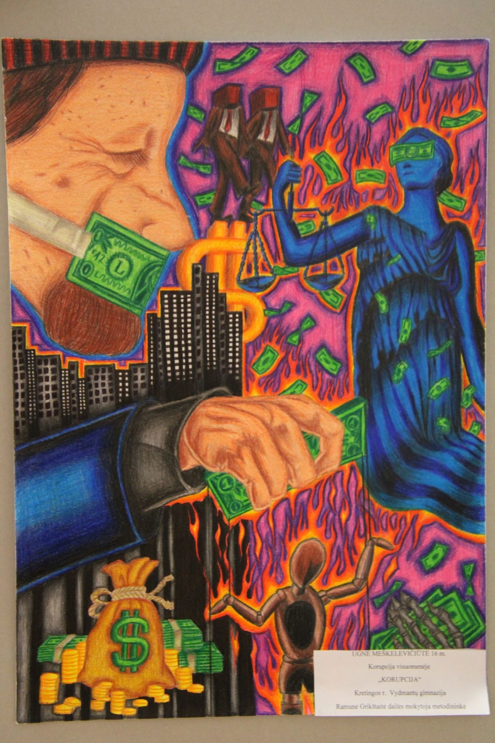 už daugiaplanę kompoziciją – Ugnei Meškelevičiūtei, Kretingos r. Vydmantų gimnazijos mokinei, už darbą „Korupcija“ (mokytoja Ramunė Grikštaitė).
