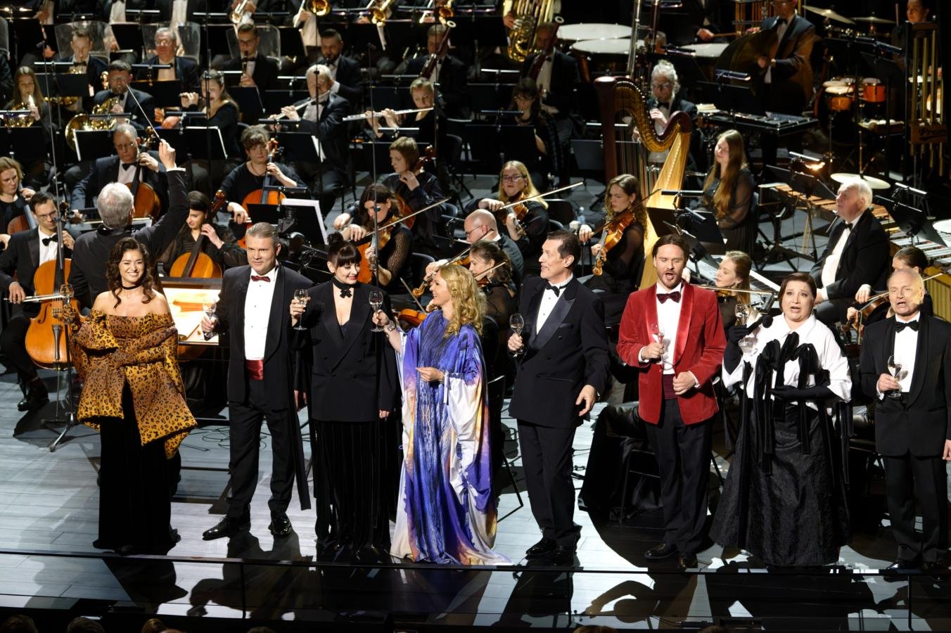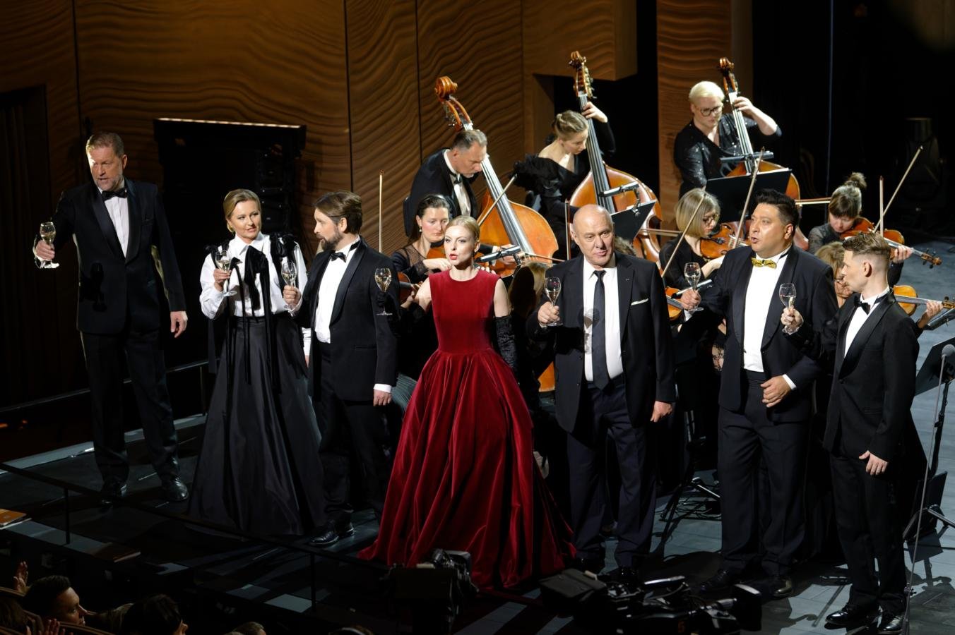 Baigiamajam Giuseppe Verdi „La Traviata“ kūriniui „Libiamo ne’lieti calici“ (Brindisi) scenoje, drauge su kviestiniais svečiais, pasirodė teatro solistai, choristai ir visi teatro darbuotojai!