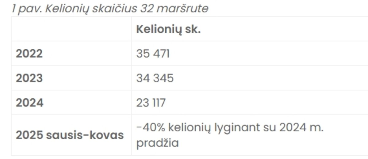 Nuo šeštadienio, kovo 29 dienos, dėl augančių nuostolių nutraukiamas maršrutinio taksi Nr. 32 Klaipėda-Kretinga darbas. Maršrutinis taksi – komerciniais pagrindais veikianti viešojo transporto rūšis, tad toliau tęsti nuostolingą maršruto darbą nebėra galimybių.