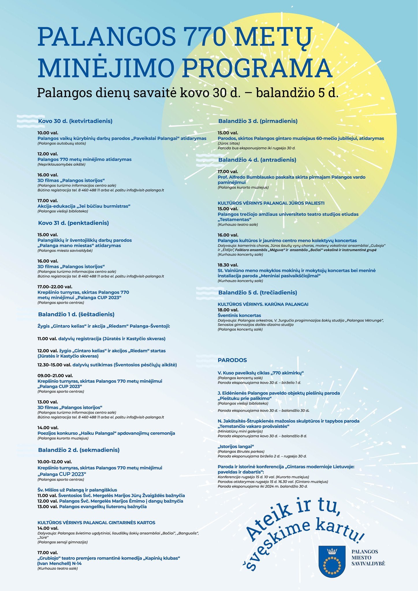 Penktadienį (kovo 31 d.) 15 val. Bus atidaroma palangiškių ir šventojiškių darbų paroda ,,Palanga mano miestas‘‘ Palangos miesto savivaldybėje. Vakare pramogų ras aktyviausieji – 17-22 val. vyks krepšinio turnyras, skirtas Palangos 770 metų minėjimui, ,,Palanga CUP 2023” Palangos sporto centre.