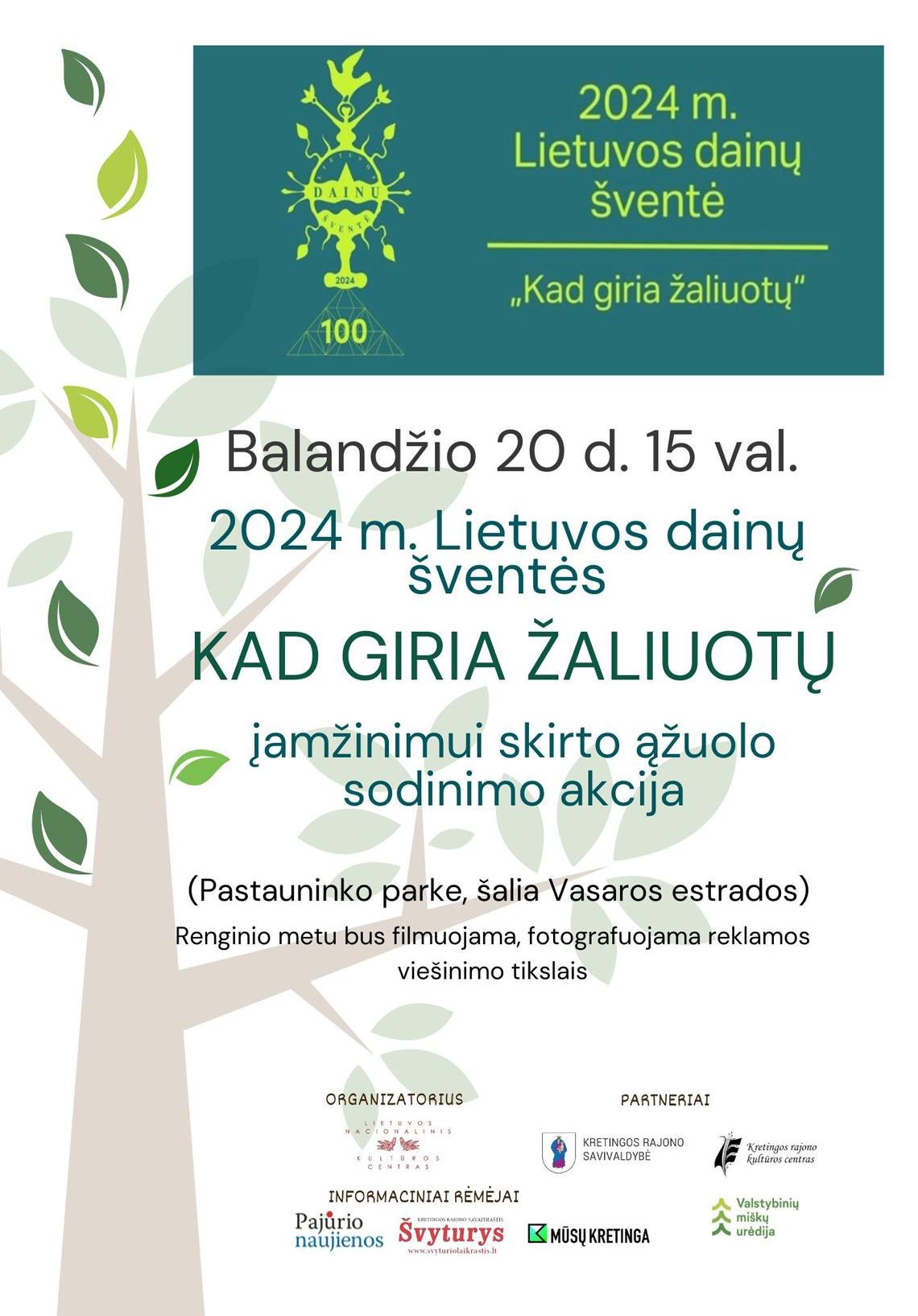 Minint Dainų šventės šimtmetį, balandžio 20 d. (šeštadienį), 10.00 val. Valstybinių miškų urėdija, Aplinkos ministerija ir Lietuvos nacionalinis kultūros centras kviečia į Nacionalinį miškasodį „Kad giria žaliuotų“ – kelių dešimčių metų tradicija tapusią medžių sodinimo šventę, suburiančią visus – suaugusius, vaikus, bendruomenes, įmones ir organizacijas. Šiemet miškasodis kviečia švęsti Lietuvos dainų šventės šimtmetį ir pasodinti medžius 100-e Lietuvos girių.\