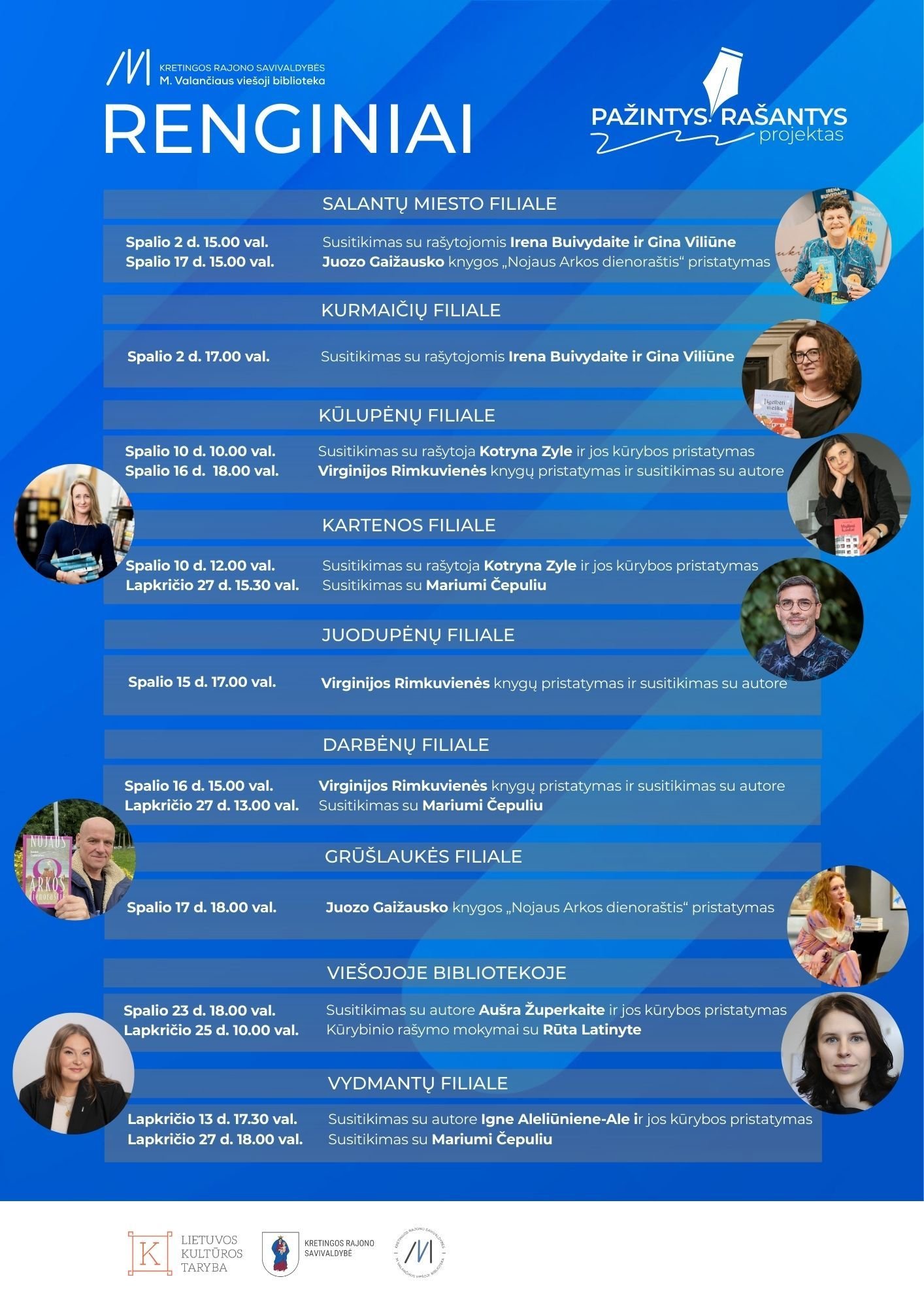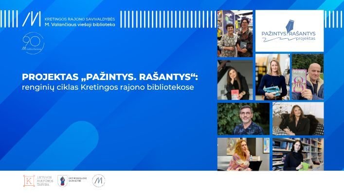 Kretingos rajono savivaldybės M. Valančiaus viešoji biblioteka kartu su partneriais pradeda įgyvendinti naują Lietuvos kultūros tarybos ir Kretingos rajono savivaldybės finansuojamą projektą „Pažintys. Rašantys“. Šio projekto tikslas – priartinti aktualiąją Lietuvos literatūrą prie rajono gyventojų, sudaryti sąlygas susitikti su žymiais kūrėjais ir išgirsti jų kūrybos istorijas iš pirmų lūpų.