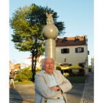 Anicetas Puškorius prie savo kūrinio Marijos Maloningosios skulptūros Voveraičių kaime.