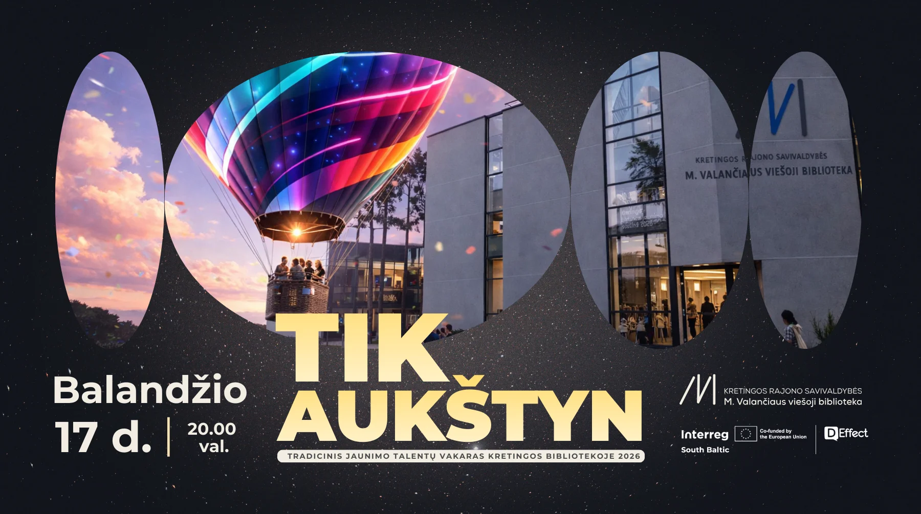 Balandžio 17 d. 20:00 val. Kretingos rajono savivaldybės M. Valančiaus viešojoje bibliotekoje jau trečią kartą vyks jaunimo talentų vakaras „TIK AUKŠTYN“.