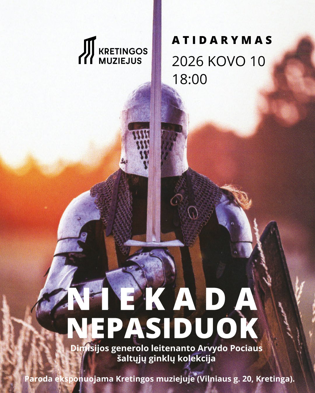 Kovo 10-osios vakarą, Lietuvai brangios Valstybės atkūrimo dienos išvakarėse, kviečiame į Kretingos muziejų. Drauge atversime buvusio Lietuvos kariuomenės vado (2009-2014), dimisijos generolo leitenanto Arvydo Pociaus šaltųjų ginklų kolekcijos parodą.