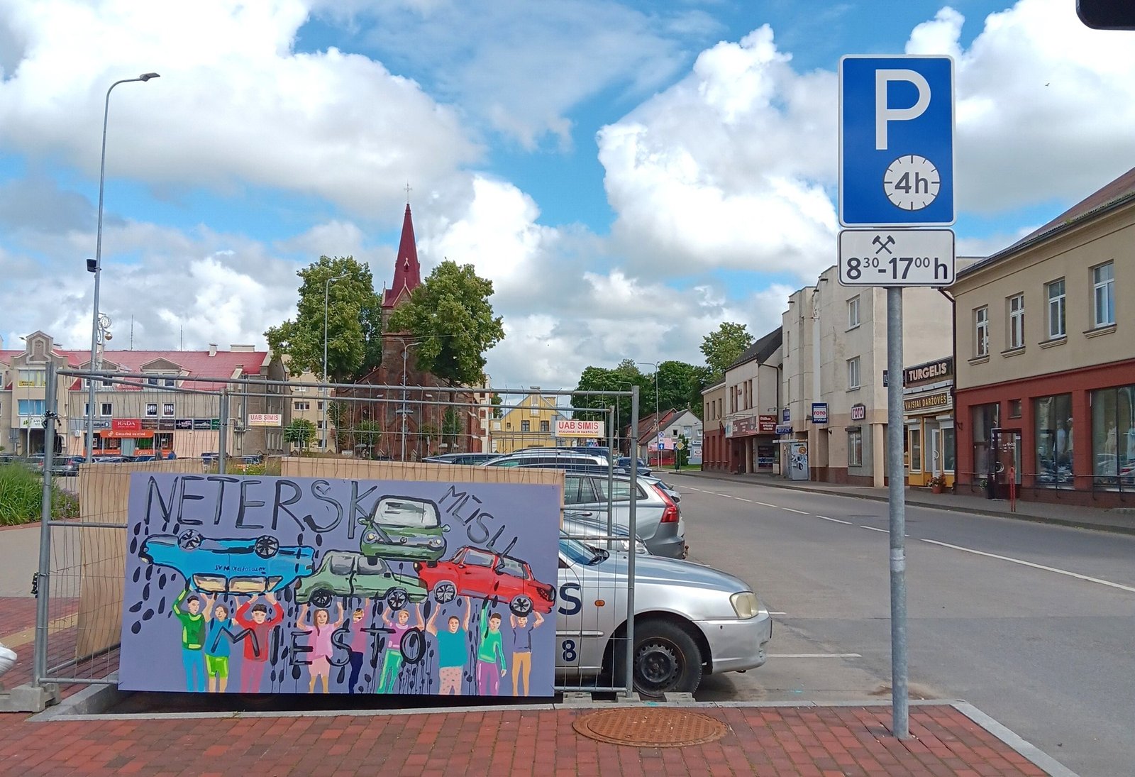 Kretingoje, pietinėje Rotušės aikštės pusėje, įrengtas naujas kelio ženklas „Stovėjimo ribotą laiką vieta“ su papildoma lentele, kuri noroda, kad ženklas galioja tik darbo dienomis.