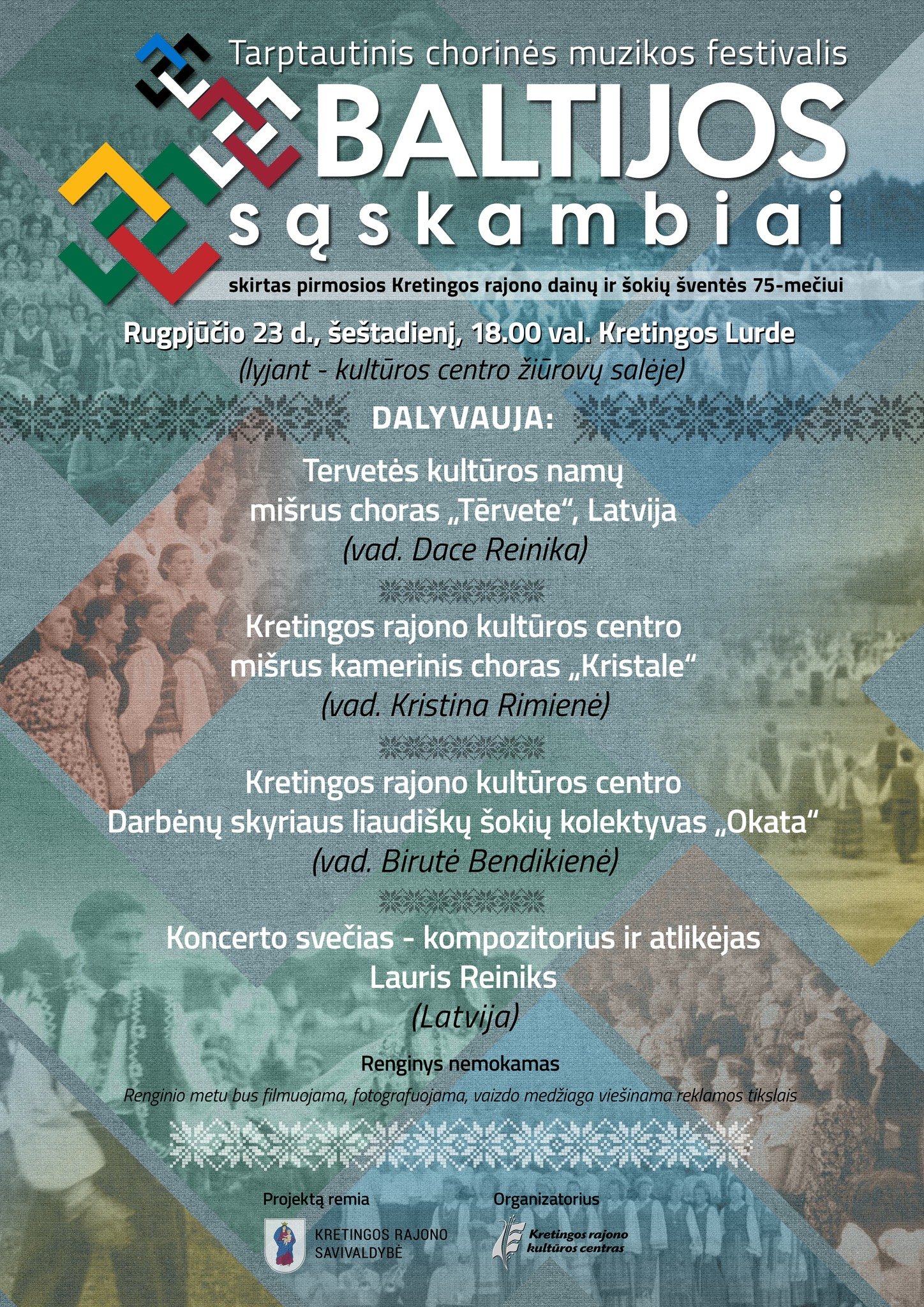 Šiemet „geografiniu“ atžvilgiu dar vis liksime Lietuvos-Latvijos kultūros „areale“, tačiau sulauksime naujų svečių – iš Latvijos, iš Tervetės miesto atvyks mišrus choras „Tērvete“ (vad. Dace Reinika), o sykiu su jais  ir ypatingas svečias – žinomas Latvijoje, Lietuvoje ir visose Baltijos šalyse kompozitorius bei atlikėjas Lauris Reiniks. Svečias dainuos ir lietuviškai. Su broliais latviais kartu pasirodys ir saviškiai – Kretingos rajono kultūros centro mišrus kamerinis choras „Kristale (vad. Kristina Rimienė), o dainų švenčių tradicijų simboliką savo šokiais primins Kretingos rajono kultūros centro Darbėnų skyriaus liaudiškų šokių kolektyvas „Okata“ (vad. Birutė Bendikienė).