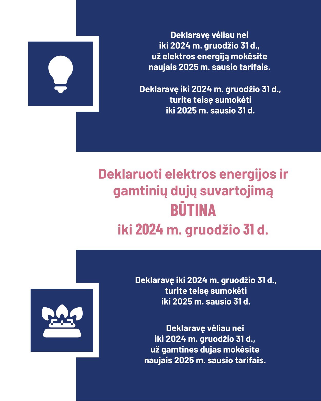 Deklaravus laiku, sąskaitos už gruodį suvartotą elektros energiją bus pateiktos sausio mėnesį įkainiu, galiojusiu iki 2024 m. gruodžio 31 d. Jeigu deklaruosite 2025 m. sausio 1 d. ir vėliau, už gruodžio mėnesį suvartotą elektros energiją bus taikomi nauji įkainiai.