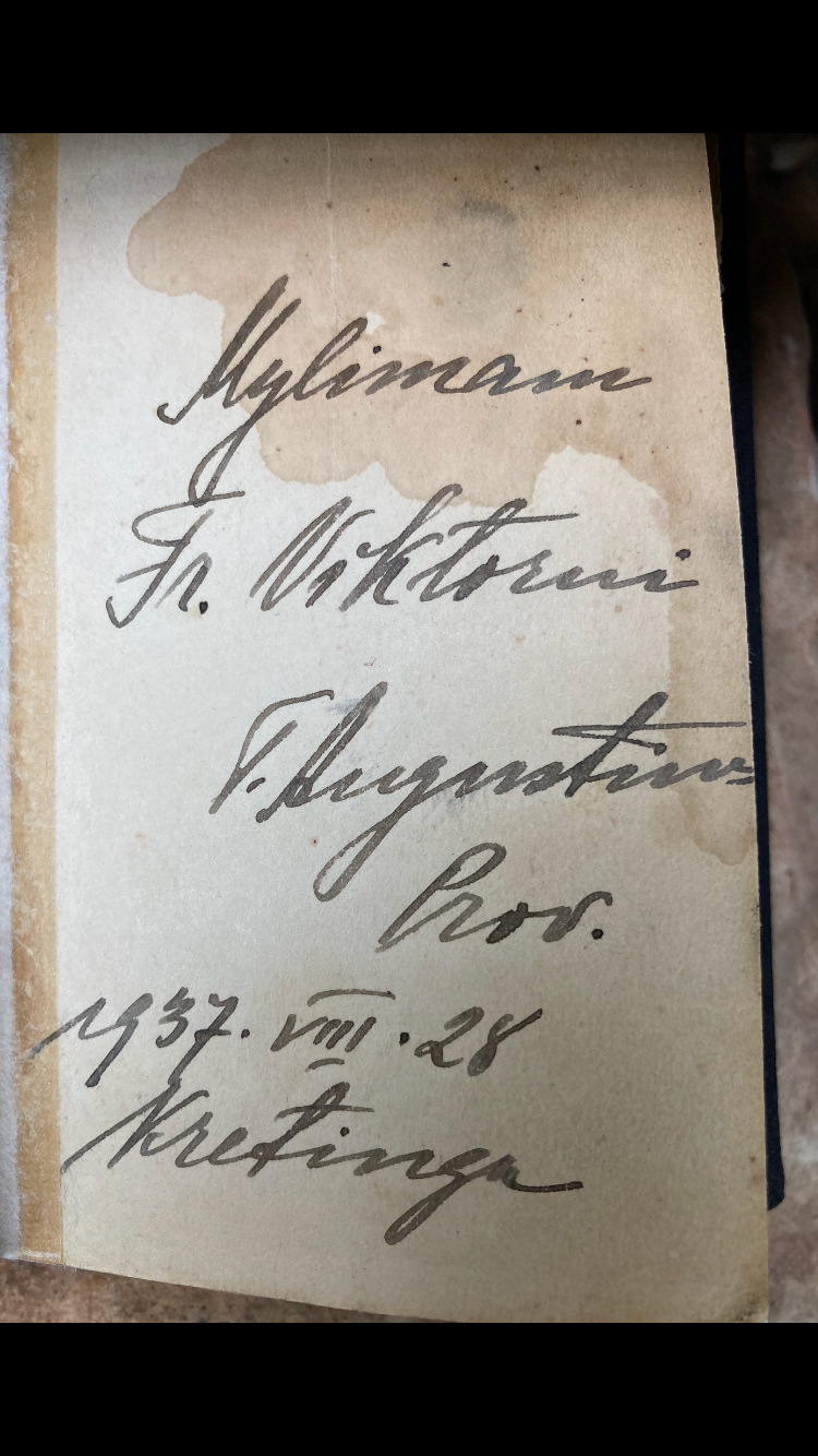 Kretingos pranciškonų gimnazijos V klasė, įsiamžinusi prie bažnyčios 1933 m. birželio mėn. Centre – mokytojas Andrius Kirtiklis, pirmoje eilėje 2-as iš kairės – Viktoras Gidžiūnas.